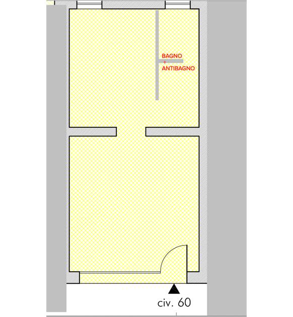 La superficie totale è di 45 ma. metà operativa, destinata all'accoglienza cliente, metà suddivisa tra retro, antibagno e bagno.