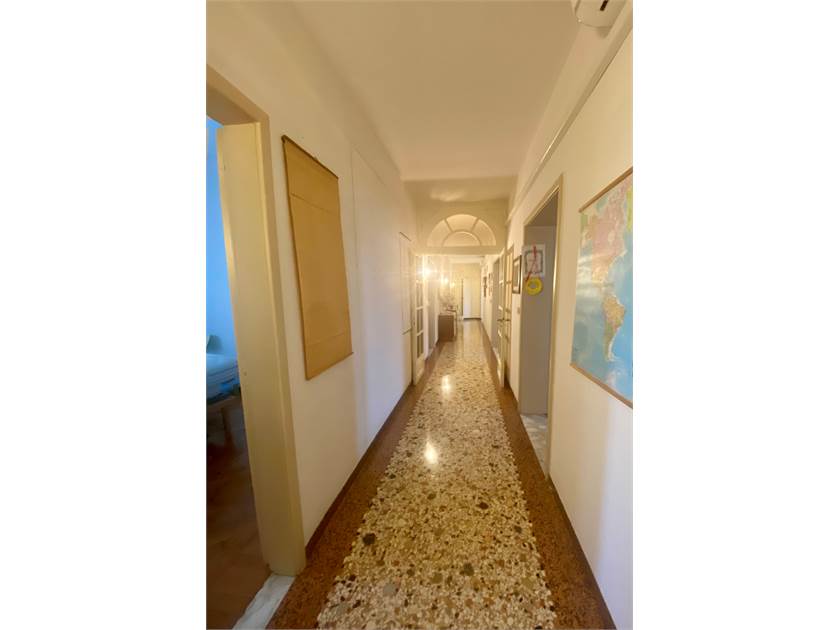 Il condominio, elegante e ottimamente gestito, dispone di un’area esterna comune con giardino e posti auto (assegnati a rotazione biennale), oltre a un locale dedicato al parcheggio di biciclette e motocicli. L’imponente ingresso, con soffitti di oltre tre metri e un ascensore storico al centro di entrambe le scale, regala un’immediata sensazione di prestigio e rappresentanza.