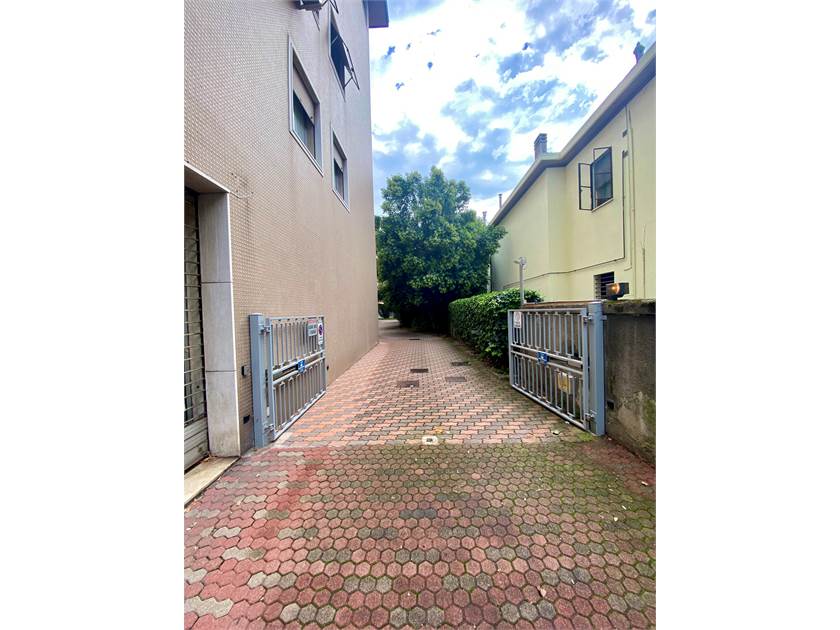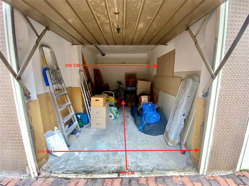 Cancello accesso comandato elettricamente, grande area manovra, larghezza basculante 214 cm, larghezza minima interna 245, lunghezza 442 cm.